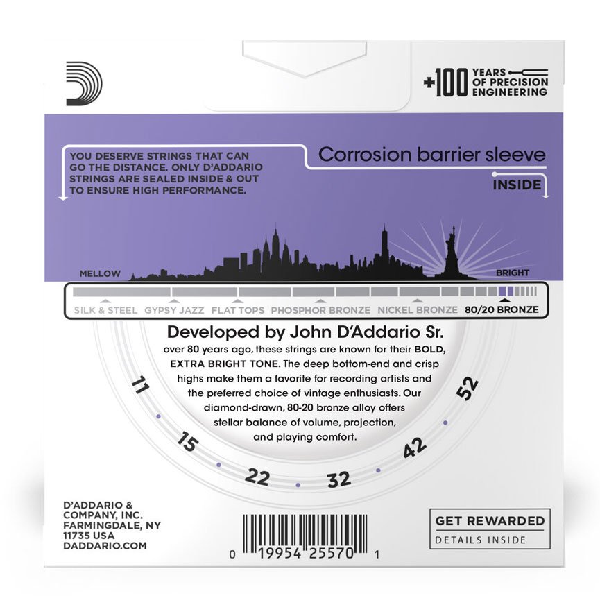 80/20 Bronze are our brightest acoustic strings, made to give your guitar an unparalleled shine. These bold sounding strings were developed by John D'Addario Sr. and guitar maker John D'Angelico in the 1930s, and have been beloved for their sparkling, trebly tone ever since. Made with a high carbon steel core and 80/20 Bronze wrap wire, 80/20 acoustic strings offer remarkable depth, along with rich, bright harmonics, and powerful projection. 11-52 Custom Light gauge strings have slightly more volume and projection than Extra Light, while still being easy to play.