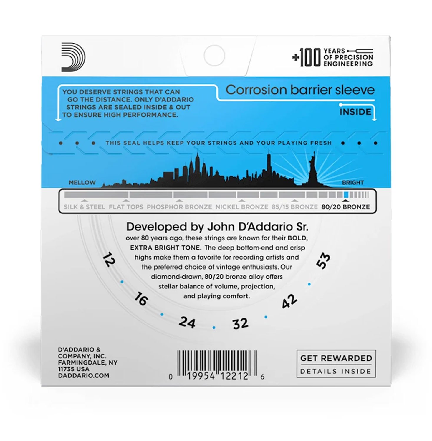 80/20 Bronze are our brightest acoustic strings, made to give your guitar an unparalleled shine. These bold sounding strings were developed by John D'Addario Sr. and guitar maker John D'Angelico in the 1930s, and have been beloved for their sparkling, trebly tone ever since. Made with a high carbon steel core and 80/20 Bronze wrap wire, 80/20 acoustic strings offer remarkable depth, along with rich, bright harmonics, and powerful projection. 11-52 Custom Light gauge strings have slightly more volume and projection than Extra Light, while still being easy to play.