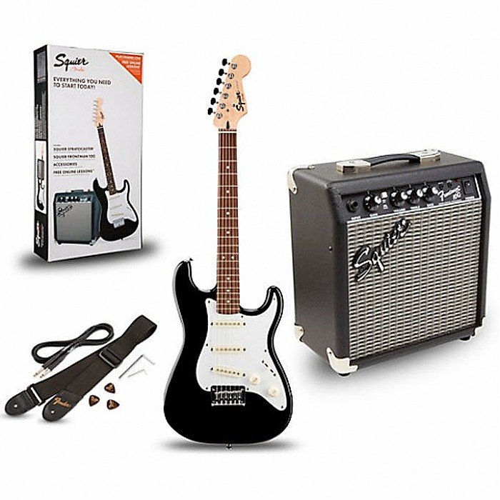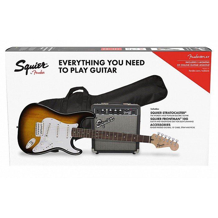 The instrument of choice for beginners, the Squier Strat Pack has everything you need to get started. The Stratocaster is ideal for players just starting out and provides a comfortable gaming feel. With a lightweight body, a vintage-style tremolo bridge for a classic feel and three single-coil pickups for classic Strat tones.