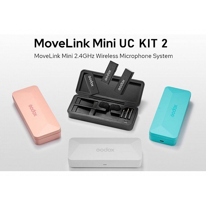 This is MoveLink Mini UC Kit 2 Wireless Microphone System from Godox features a modular output design on the dual-channel receiver with three adapters for expanded connectivity compatible with DSLR cameras, audio recorders, and smartphones with USB-C ports. Included in the system are two clip-on transmitter units, each with an integrated omnidirectional microphone for improved audio pickup. Each component communicates to each other from up to 328' away. Controls on the receiver toggle first and second levels of gain and controls on each transmitter can toggle mute or noise reduction. A foam windscreen for each transmitter helps reduce the effect of wind noise when recording outside. Built-in batteries keep each transmitter running for 6 hours and the receiver running for 8 hours. Once depleted, use the included charging case to recharge and bring the entire system on the go.