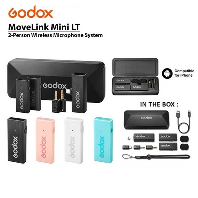 This MoveLink Mini LT 2-Person Wireless Microphone System from Godox features a modular output design on the dual-channel receiver with three adapters for expanded connectivity, compatible with DSLR cameras, audio recorders, and iOS devices with Lightning ports. Included in the system are two clip-on transmitter units, each with an integrated omnidirectional microphone for improved audio pickup. Each component communicates to one another from up to 328' away. With the enhanced sound pickup and excellent noise reduction tech, the 360° omnidirectional voice pickup mic delivers crystal-clear and natural quality, missing no more details, which is a perfect pick for live streaming, vlogging and more. Additionally, the included foam windscreen can also be used for you to effectively reduce unwanted noise like the possible friction between the skin and clothes.
