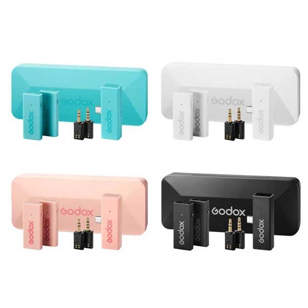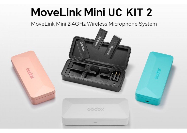 This is MoveLink Mini UC Kit 2 Wireless Microphone System from Godox features a modular output design on the dual-channel receiver with three adapters for expanded connectivity compatible with DSLR cameras, audio recorders, and smartphones with USB-C ports. Included in the system are two clip-on transmitter units, each with an integrated omnidirectional microphone for improved audio pickup. Each component communicates to each other from up to 328' away. Controls on the receiver toggle first and second levels of gain and controls on each transmitter can toggle mute or noise reduction. A foam windscreen for each transmitter helps reduce the effect of wind noise when recording outside. Built-in batteries keep each transmitter running for 6 hours and the receiver running for 8 hours. Once depleted, use the included charging case to recharge and bring the entire system on the go.