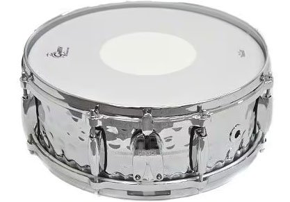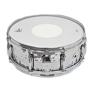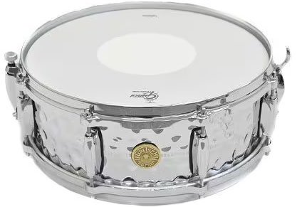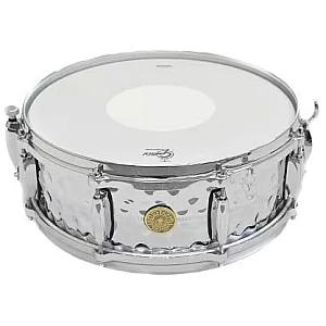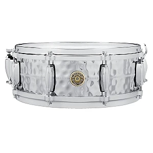 Celebrating 40 years of the 4160 5×14″ snare drum Gretsch introduces the Hammered Chrome Over Brass snare drum. With its 1.2mm hand hammered brass shell this drum favors a higher tuning range and is full bodied with enhanced sensitivity. The Gretsch 14x5 USA Custom Hammered Chrome Over Brass Snare Drum (G4160HB) features a large-hammered 1.2mm chrome-plated brass shell to produce a very distinctive, albeit slightly drier sound than Gretch’s standard Chrome over Brass snare shell. Additional features include: 45-degree bearing edges, 8 Lugs, 4mm die-cast hoops, Lightning throw-off, 'Snap-In' key holder, 42-Strand snare wires, chrome hardware, and Gretsch Round Badge.