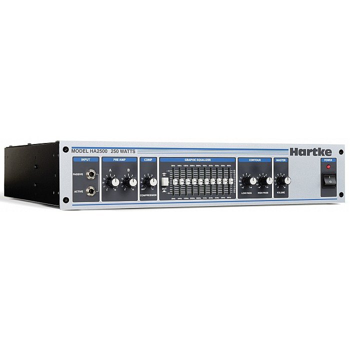 750With 250 watts of available power, the Hartke HA2500 will drive your small to mid-sized bass rig with incredible clarity and punch. The HA2500 features the new Hartke silver face chassis and includes a selectable passive or active input, tube emulation and solid-state preamps, variable compression, a 10-band graphic EQ and high/low frequency contour control.
