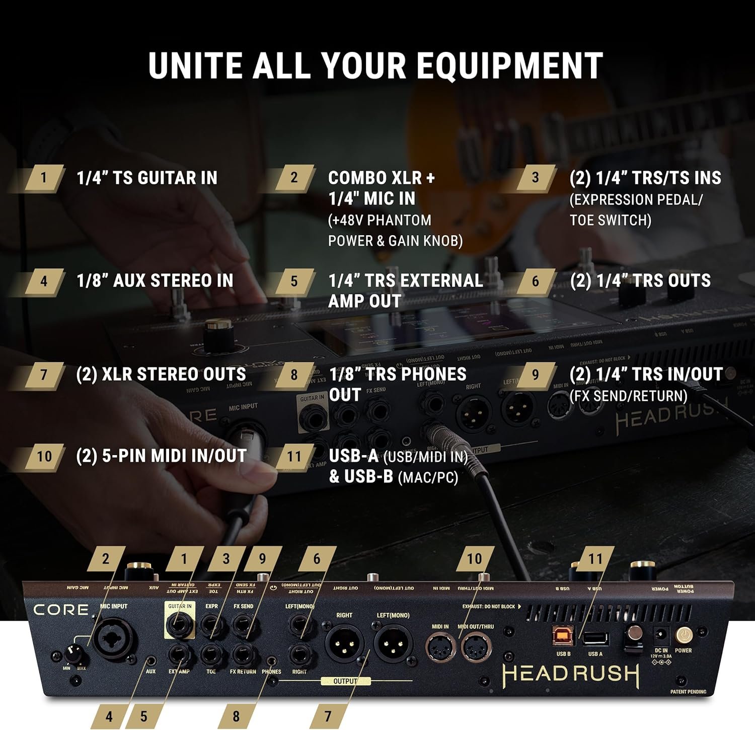 The heart of the Headrush Core’s workflow is its 7-inch touchscreen display, providing you with intuitive access to just about every feature with a swipe, touch, or drag of a finger. From dialing in the most minute parameters of your guitar rig to choosing your ideal vocal mic emulation, this touchscreen allows you to quickly and efficiently explore Core’s possibilities without a manual-heavy learning curve.