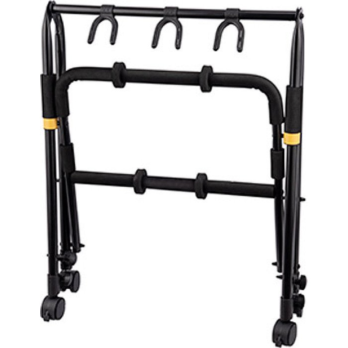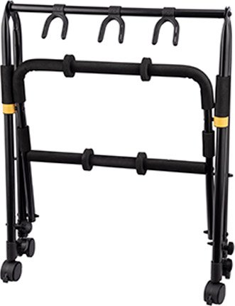 The GS523B PLUS HERCULES Multi-Guitar Rack with add-on casters accommodates three guitars and utilizes Specially Formulated Foam (SFF) padding to cover all contact points. HA205 allows expansion to accommodate up to 6 guitars.
