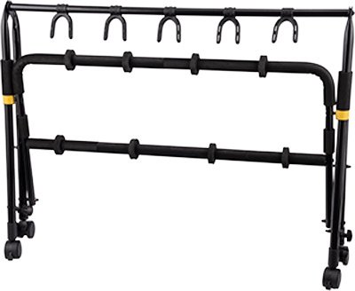 The GS525B PLUS HERCULES Multi-Guitar Rack with add-on casters accommodates five guitars and utilizes Specially Formulated Foam (SFF) padding to cover all contact points. HA205 allows expansion to accommodate up to 10 guitars.