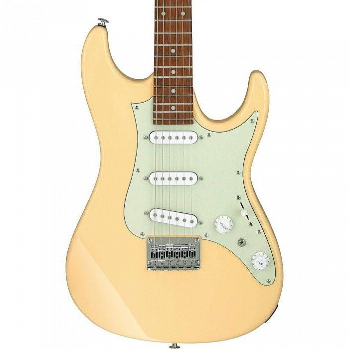 Ibanez AZES31-IV; az electric guitar; az essentials series; body: poplar; neck: maple; fingerboard: jatoba; neck mount: bolt-on; neck shape: azes; inlays: white dots; 22 medium frets; nut: plastic; nut width: 42 mm (1,65"); scale: 635 mm (25"); fingerbard radius: 250 mm (9,84"); thickness at 1st fret: 21 mm (0,81"); thickness at 12th fret: 23 mm (0,89"); pickguard: mint; pickups: essentials single-coil (bridge), essentials single-coil (middle), essentials single-coil (neck); controls: volume, tone, dyna-MIX8 system with alter switch; switch: 5-way; bridge: F106; hardware finish: chrome; tuners: Ibanez; colour: ivory; stock strings: .010 - .046.