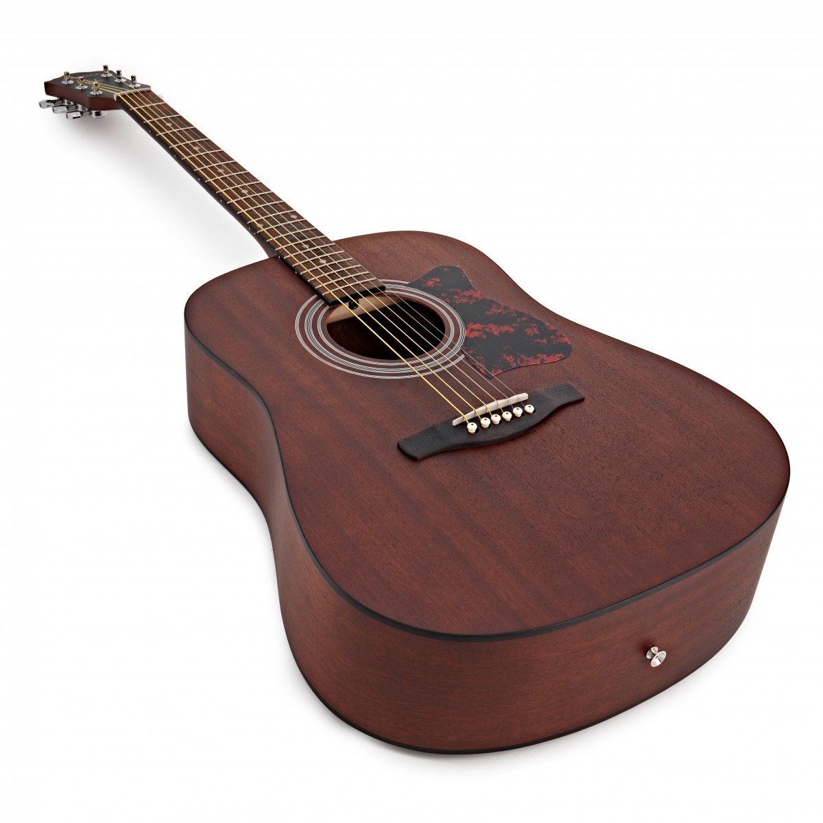 The V54NJP is a dreadnought acoustic, meaning it has a large, full body which creates a big warm sound. It's a great starting place for any guitarist and suits all styles of playing, including big, bright strumming and delicate finger picking. The Sapele wood used to make the guitar resembles a rich mahogany tone.