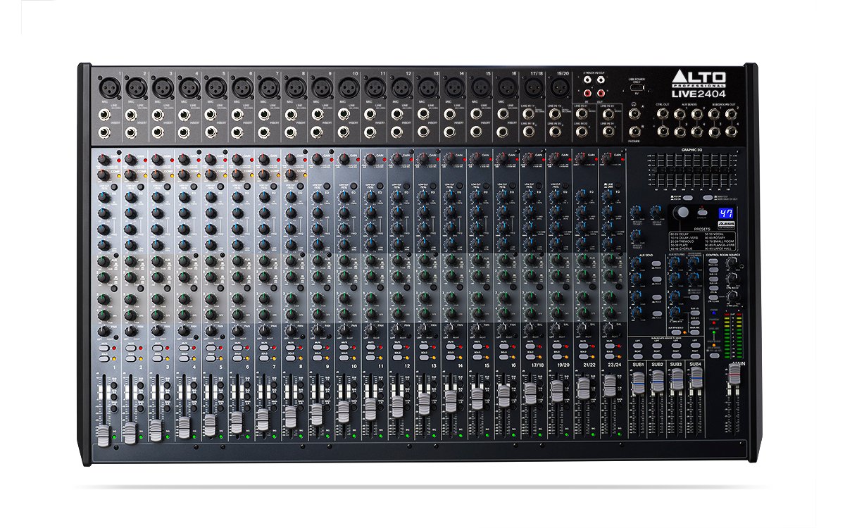 Seri Live 2404 24 channel memiliki beragam fitur standar profesional kebutuhan mixing pada situasi live sound sebagai mixer FOH maupun mixer monitor. Mixer analog memiliki keunggulan yang sangat mudah dioperasikan. Alto Live 2404 bisa kita gunakan untuk kebutuhan touring (band), DJ, hingga instalasi tetap (club, restoran, atau tempat ibadah). Total ada 18 preamp (konektor XLR) input mikrofon yang sudah disiapkan Alto 2404 ditempatkan pada panel atas.