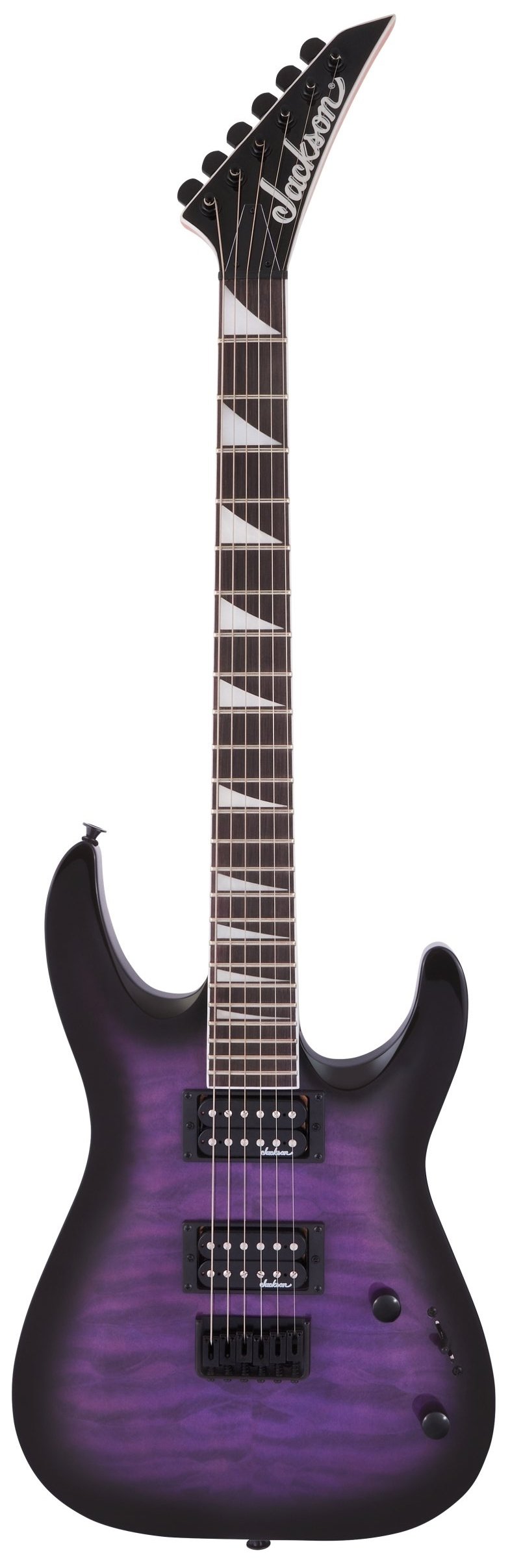 The JS Series Dinky™ Arch Top JS32Q DKA HT has a poplar body with a beautiful quilt maple arched top and a bolt-on maple speed neck with graphite reinforcement for rock-solid stability and scarf joint for reduced playing fatigue. Hosting 24 jumbo frets and pearloid sharkfin inlays, the 12”-16” compound radius bound amaranth fingerboard gradually flattens toward the heel from its more rounded profile at the nut. This makes for comfortable and natural-feeling chording and riffing near the nut, with optimal shred articulation and bending nearer the heel. Powered by direct mount dual Jackson high-output humbucking pickups with ceramic magnets, the JS32Q DKA HT also features a three-way pickup blade switch, Jackson HT6 string-through-body hardtail bridge and die-cast tuners. Sporting classic Jackson style, the JS Series Dinky Arch Top JS32Q DKA HT with pointy black headstocks and all-black hardware.