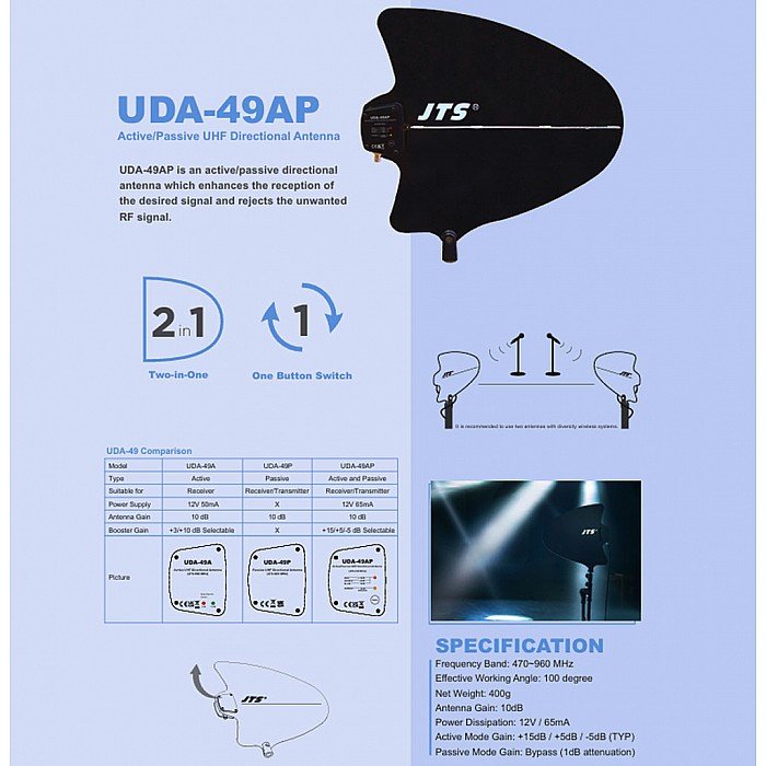 One of the standout features of the UDA-49AP is its two-in-one switching capability, allowing users to toggle between active and passive modes with a single button. This makes it suitable for both receivers and transmitters, unlike the UDA-49A (active only) and UDA-49P (passive only). The gain settings are color-coded for easy identification: Red (+15dB), Green (+5dB), Blue (-5dB), and Amber (0dB bypass mode). This antenna is particularly recommended for use with diversity wireless systems, ensuring stable and reliable signal reception even in challenging RF environments.