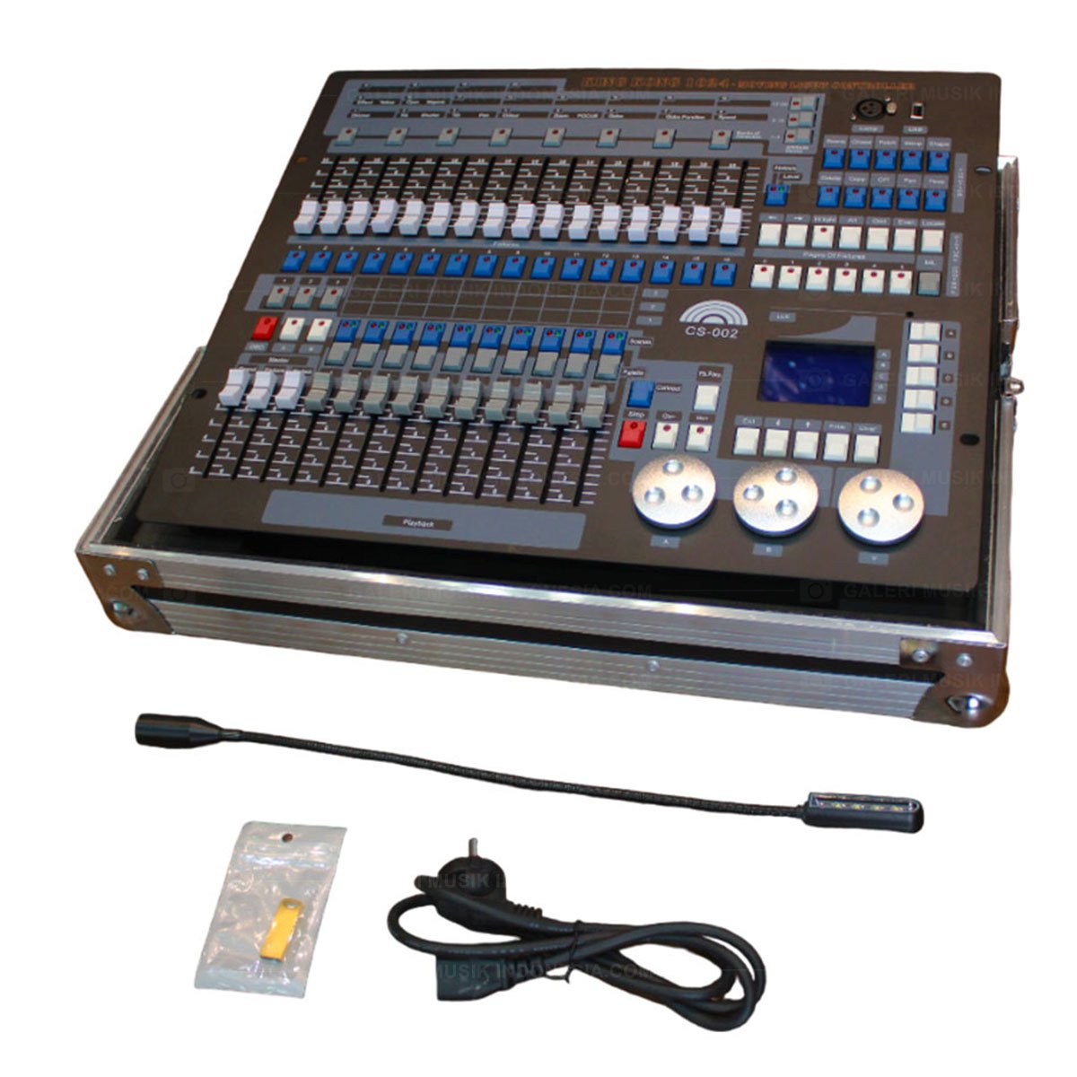 The maximum control 96 computer light or 96 road lamp dimming, and using pearl light library. built-in graphics trajectory generator, 135 built-in graphics, convenient to graphics trajectory control of computer lights, picturesque circle, spiral, rainbow, chasing a variety of effects. Graphic parameters (such as amplitude, velocity, distance, wave, direction) can be setting independently. 60 replay scenes,usage for multi step scenes and single step scene. and Multi step scene can be stored up to 600 steps. backlit LCD display screen, display in English U disk backup and upgrade. specialized gooseneck lamp, suitable for indoor and outdoor stage. Size: 48.5 x 42 x 10.5cm