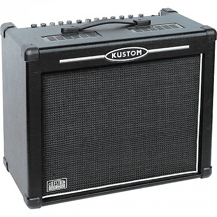 The powerful Kustom HV65 combines 65 watts and one 12-inch Celestion. Visually, the HV65 sports vents on the top panel and a cool, rear-panel cutaway with mesh screen to view the preamp tube inside the chassis. Other details include new die-cast Kustom logos, jet-black grill cloth, white piping and black leather handles.