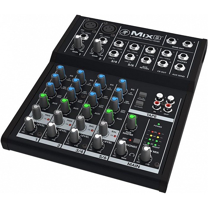Get full-scale functions and quality audio with the midsize Mackie Mix8 desktop audio mixer. This compact 6-input mixer offers a pair of microphone preamplifiers with switchable phantom power for your condenser microphones, and two additional channels offer inputs for keyboards, drum machines, and other stereo gear. But what makes the Mix8 stand out from similar mixers are its the 3-band equalizers and aux sends on each channel. For added convenience, the Mackie Mix8 even comes equipped with an RCA I/O path for recording and separate volume controls for the main and the headphone outputs.