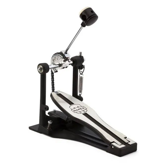 The P410 single pedal features a full-length foot board for an authentic playing feel with a reinforced bass plate for complete stability distributing the force of each stoke evenly for a pedal that performs well above where it should. The two-sided bass drum beater gives the player a choice of round and warm attack from the felt side or pointed and articulate attack from the solid side. This is the ideal beginner kick pedal, featuring single-chain drive for an accurate and smooth kick response. With adjustable spurs, reversible beaters and solid base plates, the P410 delivers a consistent performance and great durability at an affordable price, ideal for younger players or beginners who are looking to make their first purchase.