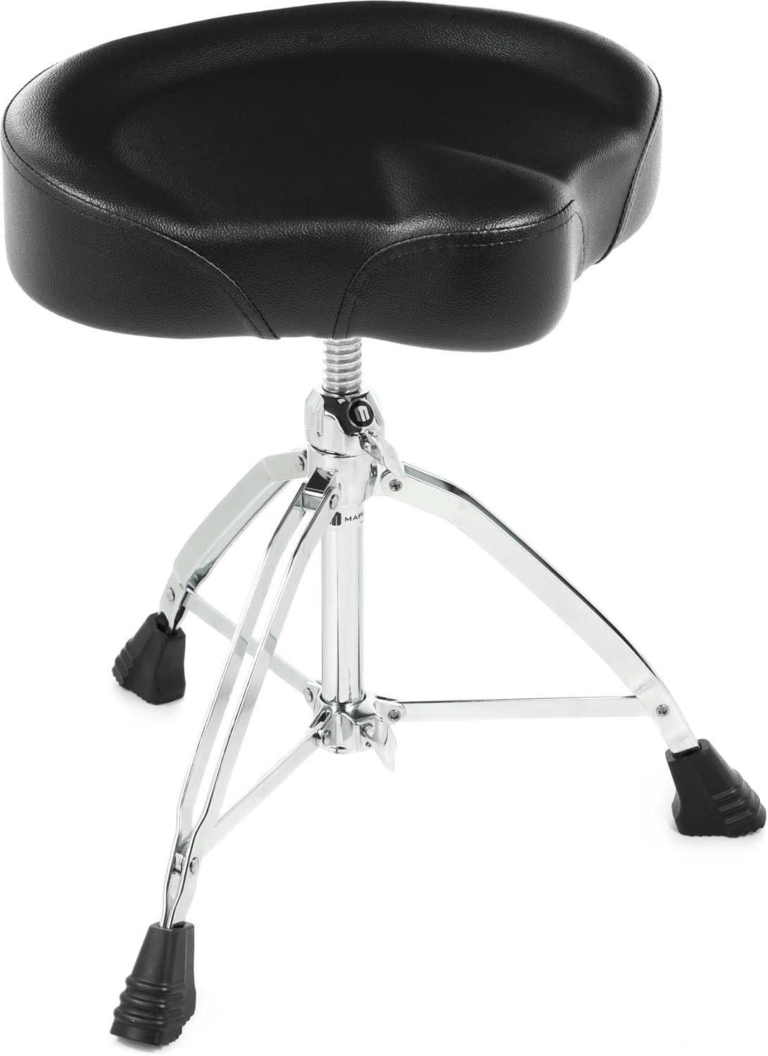 The 800 Series of drum thrones from Mapex supplies the exceptional comfort and adjustability that all timekeepers will completely treasure behind the kit. Based on double-braced tripod legs with extra-large slip-proof feet, all drummers have found these Mapex thrones to be as stable as the come, offering incredible performance security onstage, in the studio, and everywhere in between. The ultra-secure clamp mount and spindle-locking threaded steel post provide additional sturdiness. Plus, no matter how high or low your height preference is, this throne’s 6-inch range ensures that you’ll keep hammering away worry-free. The T855 model comes equipped with a 17-inch-wide x 4-inch-thick saddle top cushioned seat with a soft vinyl covering, providing plenty of cushion for comfortable drum sessions time and time again.