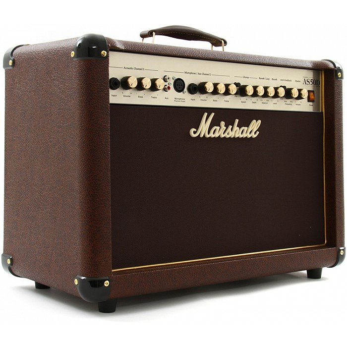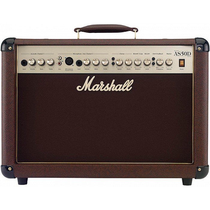 Marshall's AS50D is a 50-watt, 2 x 8" acoustic guitar combo amp with 2 channels, including a phantom-powered microphone channel. It features a redesigned tweeter, digital chorus and reverb, and an anti-feedback notch filter. Each channel sports its own volume, EQ, FX loop, and D.I. output. Master volume, line out and RCA inputs round things out nicely.