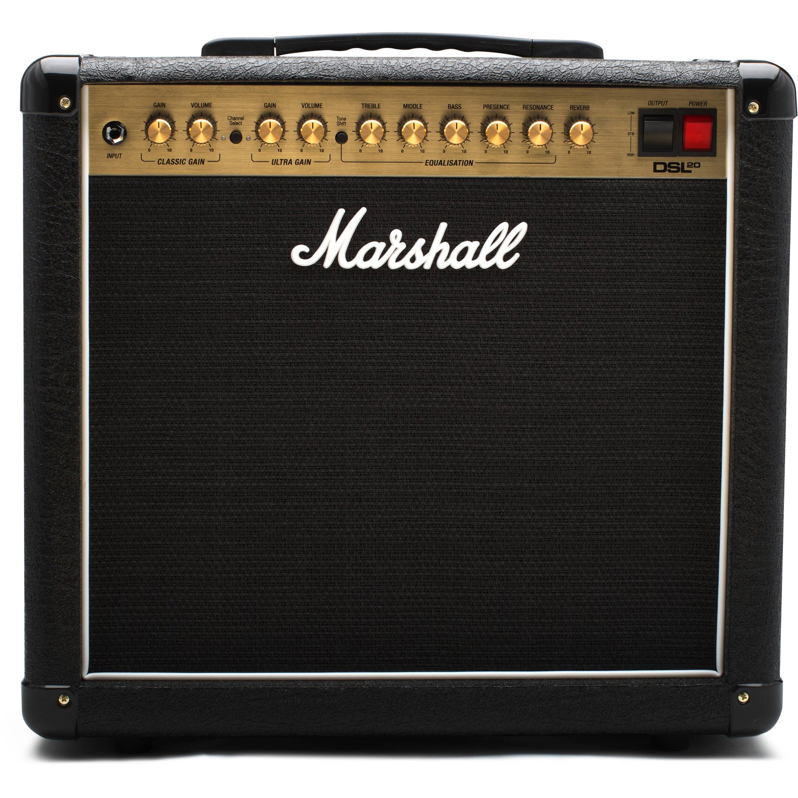Designed to replace the 15W model in the company's DSL line, the Marshall Amplification DSL20CR is a three-valve, 1x12" combo amplifier for electric guitar. It features two channels with separate controls for volume and gain, a comprehensive equalization section, and reverb. The Dual Super Lead (DSL) offers Classic Gain and Ultra Gain channels. Though the amplifier offers many of the same features of the 15W model, this amplifier improves upon the design of the DSL20CR in several ways. For instance, the power-reduction switch has received an upgrade. Whereas the 15W model sported a back-panel selector that flipped between pentode and triode operation, the DSL20CR boasts a front-panel rocker switch that works directly with the transformer, rather than the tubes. Thus, when you switch from 20W to 10W, you'll experience no shift in tone.