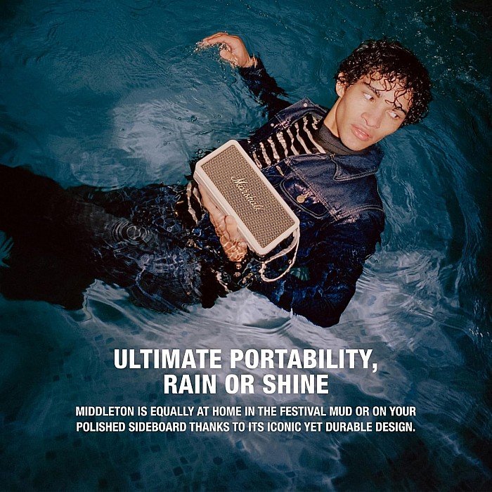 Middleton is equally at home in the mud at festivals or on your polished buffet thanks to its iconic yet durable design. With an IP67 dust and water resistant body, a little rain and dirt won’t get under its skin. Middleton keeps the music rolling with 20+ hours of portable playtime on a single charge. When you need to recharge, plug in your speaker and your battery will be back to full in just 4.5 hours – your next encore won’t be far behind. The Middleton holds true to the iconic design that reflects the brand’s heritage while also embodying Marshall’s more sustainable approach. The speaker’s sturdy build is made from 55% post-consumer recycled plastic from discarded electronics, water bottles, and automotive headlight covers, and is 100% PVC-free.
