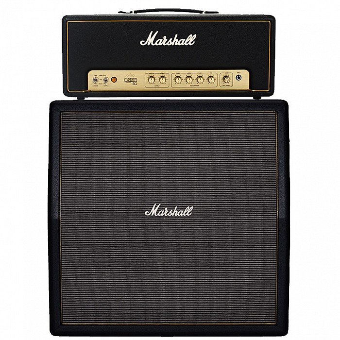 Go big! The Marshall Origin 412A angled speaker cab pairs perfectly with Origin all-tube heads to create the midrange-rich tone of a vintage Marshall rig.