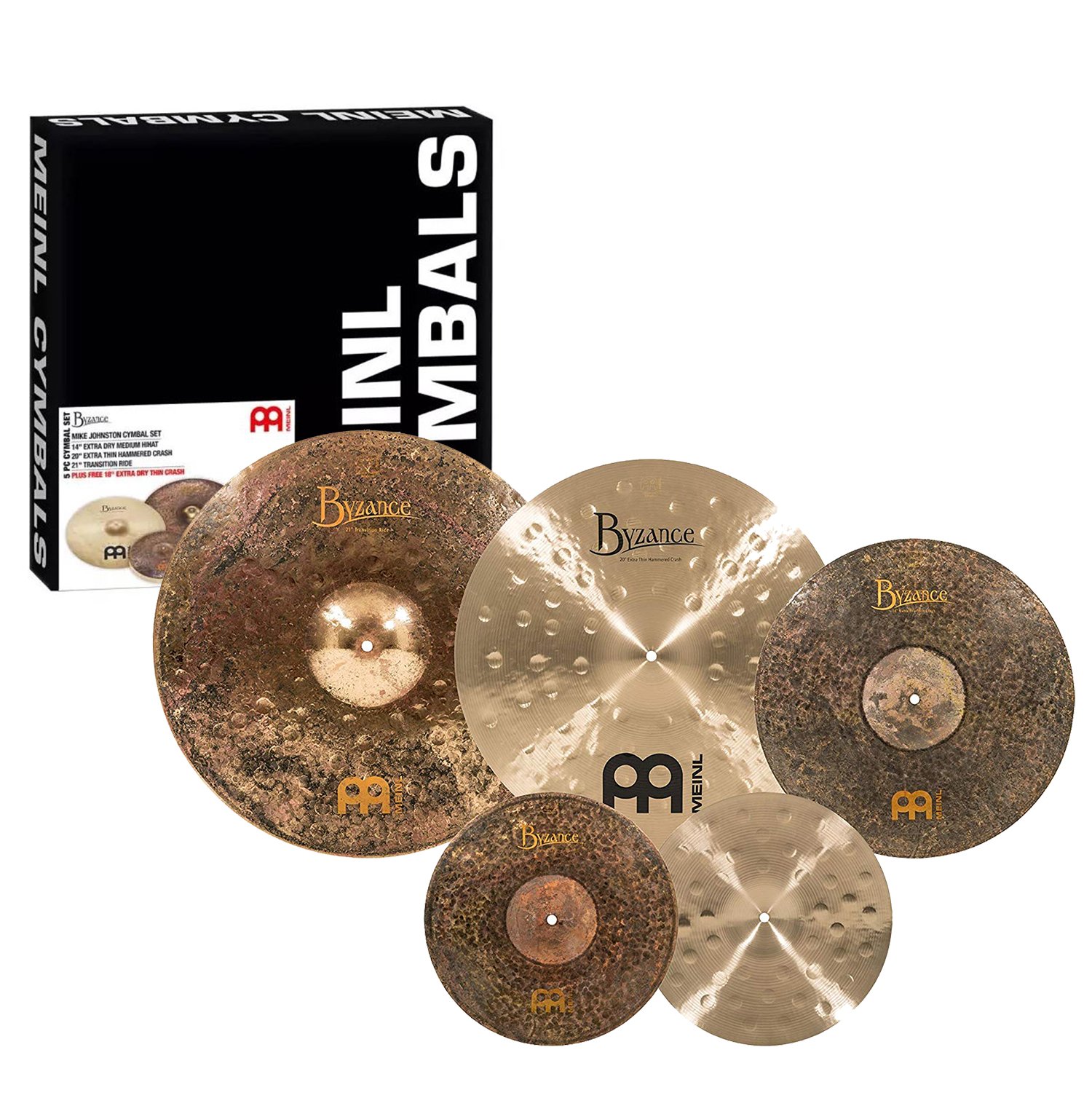 The Meinl Mike Johnston cymbal box set contains a variety of Byzance models that Mike chooses for his standard set up when conducting lessons and performing. Included in the box are 14" Byzance extra dry medium Hi Hats, 20" Byzance extra thin hammered crash, 21" Byzance Mike Johnston signature transition ride, plus a free 18" Byzance extra dry thin Crash.