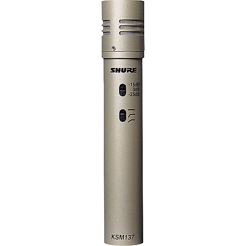 An excellent choice for acoustic guitar and piano. The Shure KSM137 is an end-address condenser microphone with a cardioid polar pattern. Designed for studio use, yet rugged enough for live applications, the KSM137 mic can withstand extremely high sound pressure levels. Its low self-noise and extended frequency response make it ideal for recording acoustic guitar, drum overheads, and hi-hats. Other features include Shure's Class A transformerless preamp circuitry for transparency; extremely fast transient response with minimal distortion; a highly sensitive 2.5-micron gold-layered mylar diaphragm; and a switchable, 3-position low-frequency filter to limit unwanted background noise and proximity effect. The microphone can capture sounds between 20Hz and 20kHz. The Shure KSM137 microphone sports a champagne finish and comes with accessories including a break-resistant mic clip, carrying case, and Popper Stopper windscreen. Requires phantom power. FEATURES