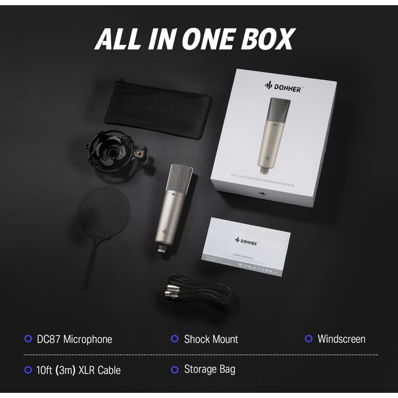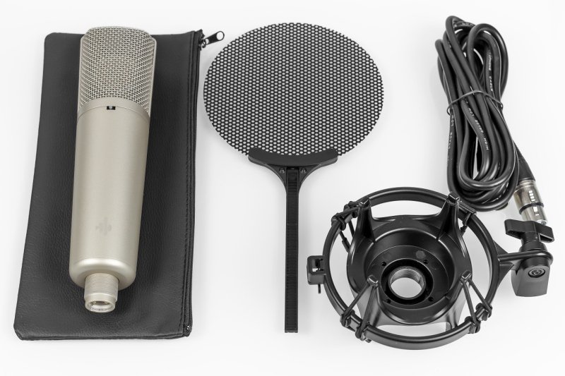 The Donner DC-87 is a studio condenser wide-diaphragm microphone. It uses a capsule with two diaphragms that provide three polar patterns. The microphone comes with a flexible gimbal, pop filter, and connection wire, allowing you to start recording after purchase. There is no doubt that Donner was inspired by the legendary Neumann U87 when creating its microphone. This is confirmed by the numbers in the name and certain external similarities. The DC-87's elongated one-piece metal body with a thickening at the top and a protective mesh with a characteristic tapered design are a bit reminiscent of microphones from the German manufacturer. In our opinion, there is nothing reprehensible in this. Let the appearance of the microphone repeat the legendary model rather than be pretentious or ridiculous. On the front of the microphone there is a switch that changes the polar patterns.