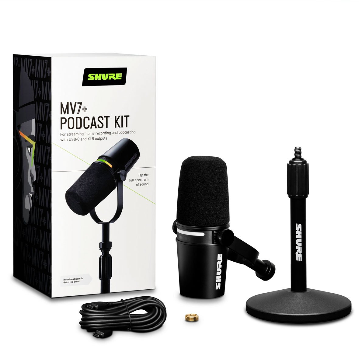 The Shure MV7+ is the updated version of a dynamic microphone designed to capture high-quality audio for podcasting, streaming and music making via hybrid USB-C and XLR outputs. It has a customizable LED touch panel that can display millions of color combinations while acting as a live audio level meter. When using the USB-C output and the MOTIV Mix™ desktop app, the MV7+ can access DSP features such as a Digital Popper Stopper™, real-time Denoiser and 3 types of reverb, as well as gain, EQ, compression and more. The microphone has a durable all-metal design with an adjustable yoke.