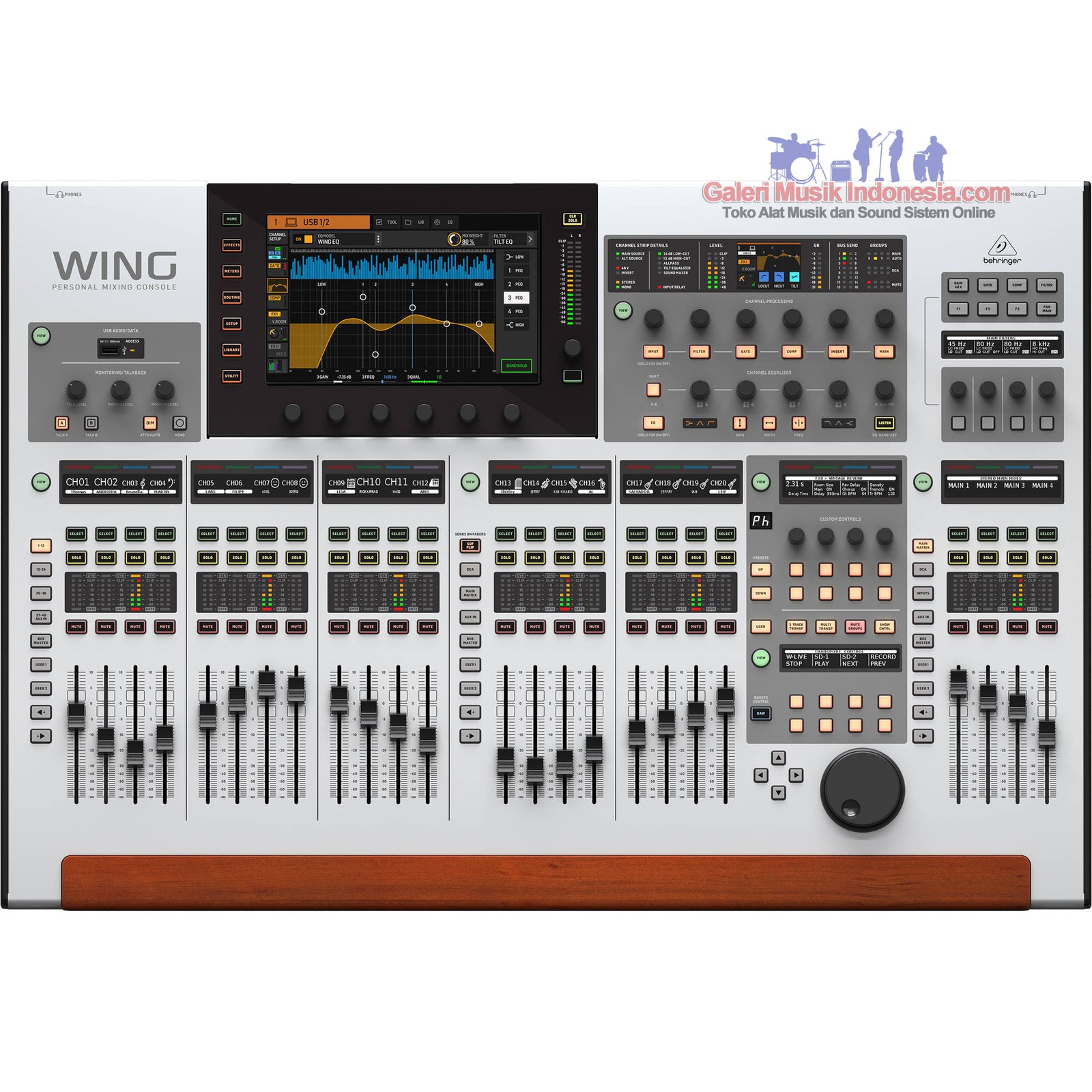 The WING control surface utilizes a large capacitive touchscreen interface with touch sensitive rotary controls for a new ease of operation. Three separate fader sections and a Custom Controls section can be tailored easily and intuitively for meeting your personal requirements. No matter, if you need a specific bus send fader next to the corresponding channel fader, or a dedicated “money” channel always at your fingertip, or even sharing the surface with two engineers - WING can be configured for elevating your production to a new level. You can even replace and customize the massive wooden armrest with something funkier, if you like.