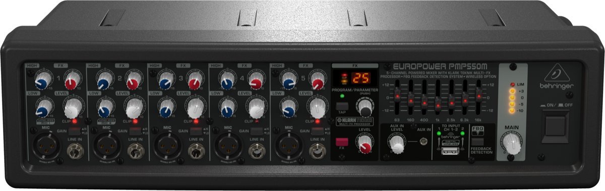 Behringer Europower PMP550M Powered Mixer at a Glance:The PMP550M sports a built-in FX processor featuring 25 effects presets. You get a whole slew of delays, reverbs, modulations, pitch-shifters, and multi-FX to spice up your sound. Add a hint of reverb and delay to vocals, or a lush chorus to your acoustic guitar. The PMP550M's 24-bit digital effects add a professional touch to any performance.