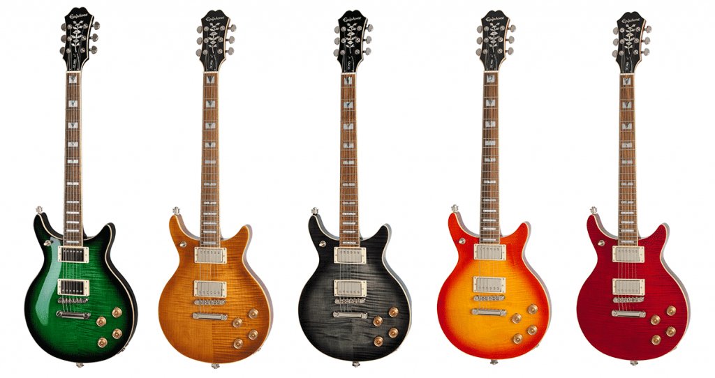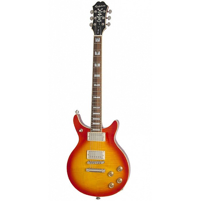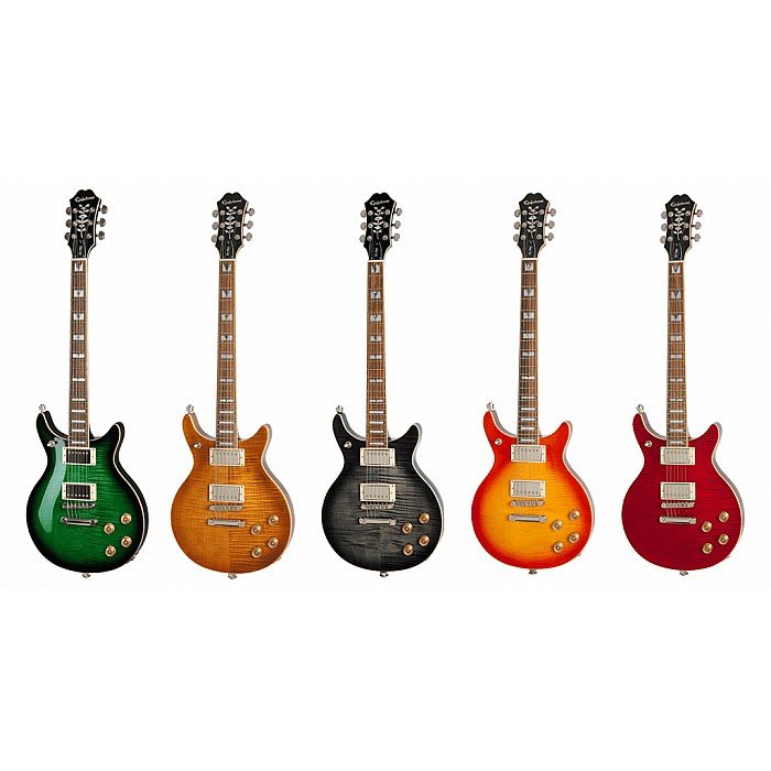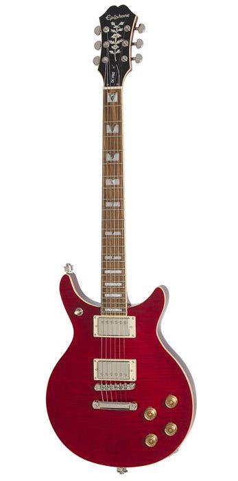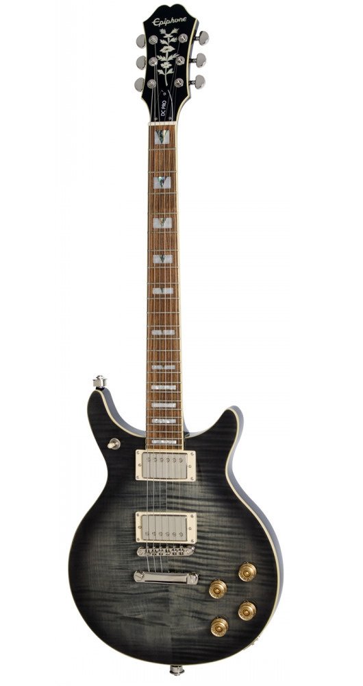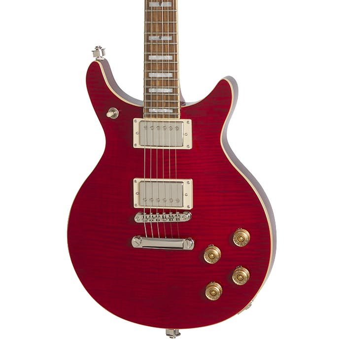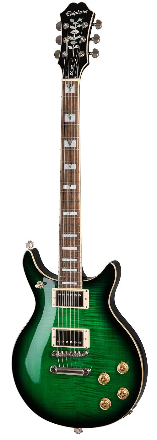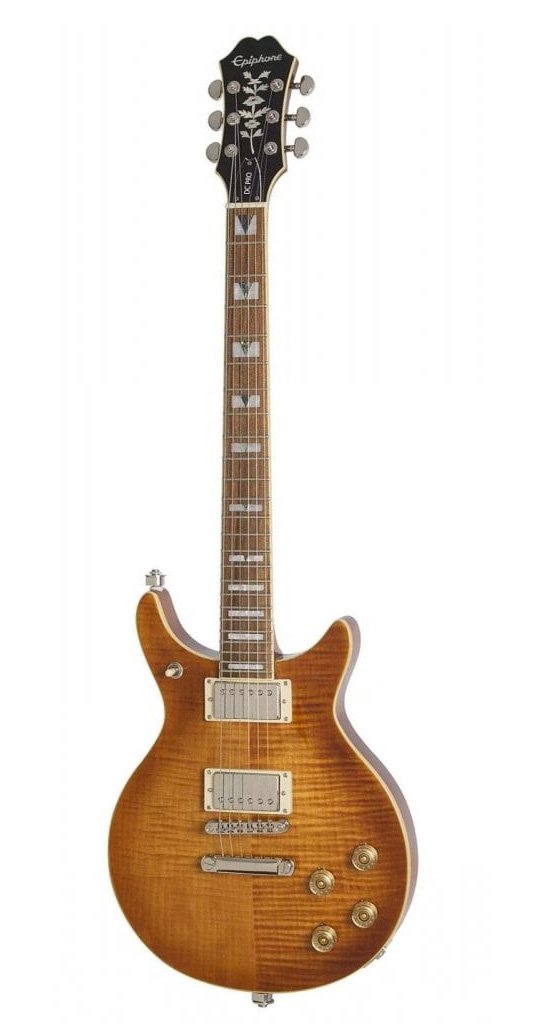 The DC PRO is Epiphone’s modern take on the classic Del Rey Double Cut design. Featuring a solid mahogany body with a AAA flame maple veneer top, ProBucker™ humbuckers with coil-splitting, and a treble bleed circuit to maintain clarity at reduced volumes. Now available in Black Cherry, Faded Cherry Sunburst, Midnight Ebony, Mojave Fade, and Wild Ivy.