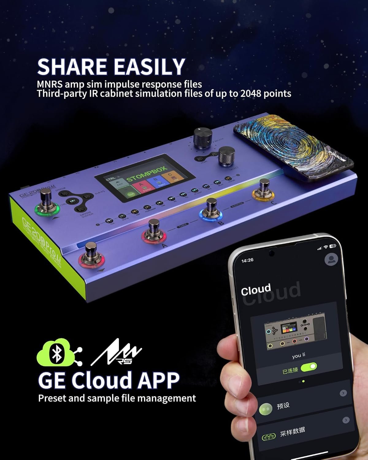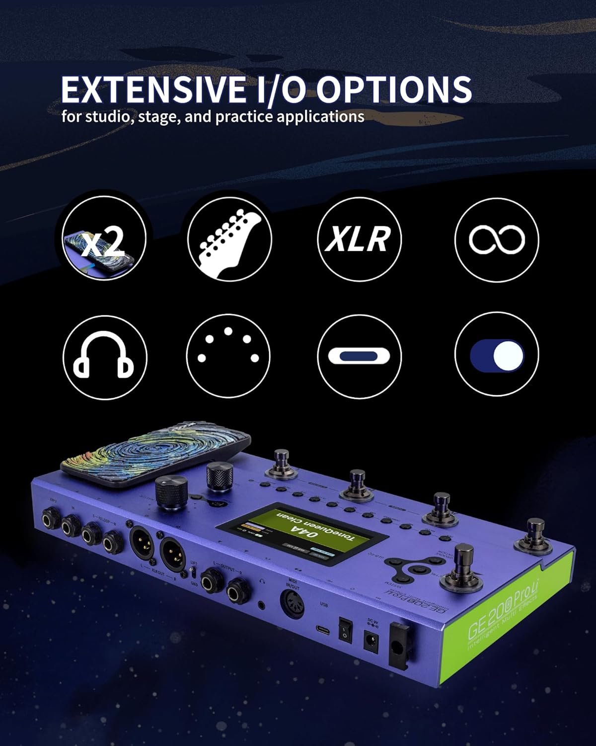 Further adding to the GE200 Pro’s unique interfacing options, an onboard expression pedal, configurable as a volume control or effect expression pedal, is also built into the device. Impressively, the pedal’s 1/4" stereo TRS jack can also be used to connect an external expression cable. The GE200 Pro also has a Groove Station mode, which encourages creative practice and performance workflows. It includes a drum machine with 70 patterns, metronomes, and a 60-second phrase looper that can be BPM-synchronized. A precise built-in instrument tuner, tap tempo control, and adjustable Global EQ settings are also integrated, contributing to an all-in-one guitar suite that prevents the need for external pedals and devices. Digital connectivity is another highlight, with support for Bluetooth audio playback enabling the streaming of backing tracks to the GE200 Pro. Programmable MIDI inputs and outputs are also provided, helping audio technicians to dynamically control many pedal features through a MIDI controller or DAW. Finally, the GE200 Pro’s Bluetooth support extends to connecting with the GE CLOUD app, allowing users to upload and download presets and sample files easily.