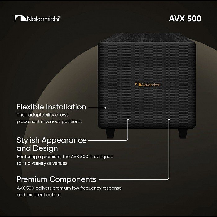 The Nakamichi AVX 500 uncovers what you've been missing in your musicmovies and games clean chest-thumping bass. The High performance subwoofer provides deep bass and placement flexiblitily thanks to its front firing driver and all digital amplifier.