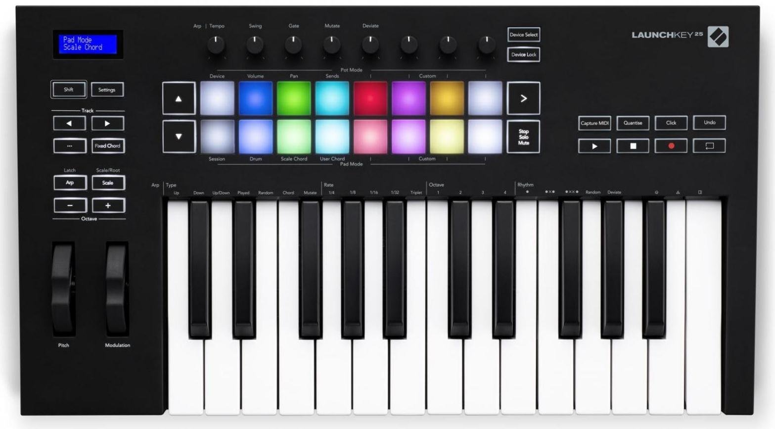 The Novation Launchkey Mini mk3 is your ticket to on-the-go creation with Ableton. This miniature controller is über functional, has useful features, and easily fits in your backpack. It has 25 synth-action mini keys and 16 velocity-sensitive RBG pads that you can use to play your way. You can use the illuminated pads to play samples, trigger loops, and control drums. The Launchkey Mini mk3 USB Midi Controller is designed to work seamlessly with Ableton Live. Even if you use a different DAW, your new Launchkey will work with it. No matter what you’re creating, your Launchkey will handle it like a champion.
