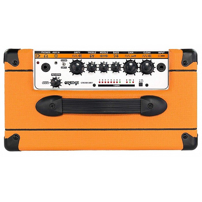 The Orange Crush 20RT 20W guitar combo builds on Crush 20's twin-channel tonal platform and feature layout with the addition of lush digital spring reverb and on-board chromatic tuner. Create huge dreamy reverb trails perfect for soundscape effects or add subtle hints to make your lead lines shine through. And, with Orange's CabSim technology, you get an emulated 4x12" cab tone through the headphone output to give you huge sound even when you're practicing silently.