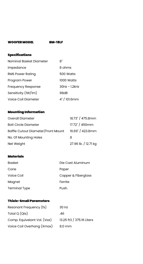 Spesifikasi P Audio BM18LF 18 Inch Professional Low Frequency Woofer Handles 500W