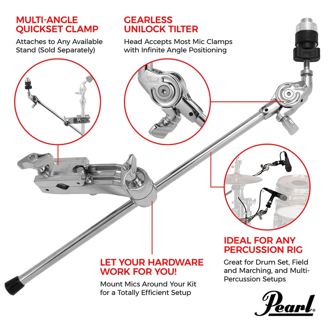 Pearl's Uni-Lock Boom Microphone Holder features a multi-angle quickset clamp that attaches to any available support stand with ease. Now you can place mics in hard-to-reach places around the drum set with the security of Pearl's reliable drum hardware. Its durable boom arm delivers secure, flexible reach, and its gearless UniLock tilter head accepts practically any mic clamp with infinite angle positioning.