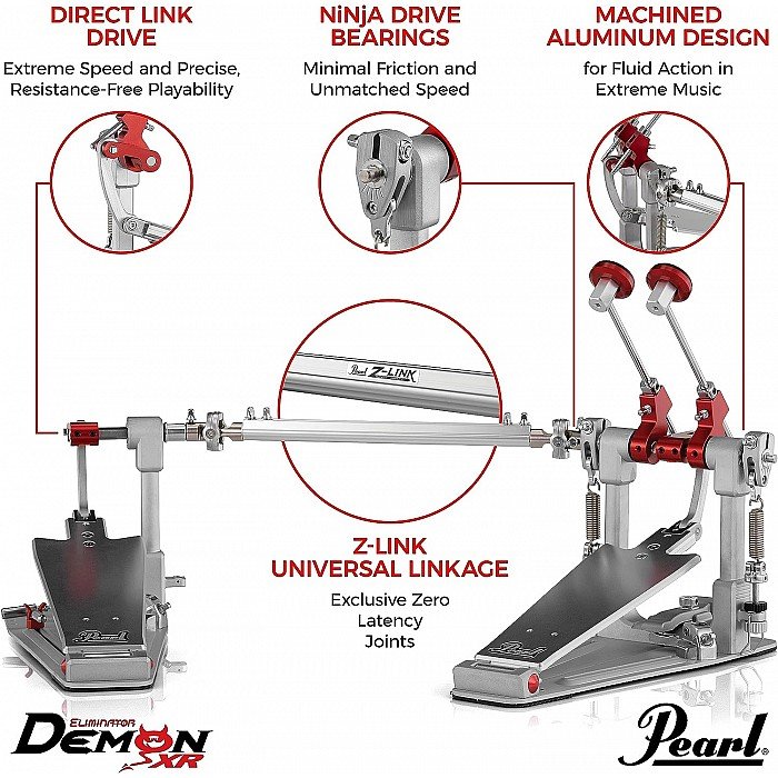 The Pearl P3502D Demon XR direct-drive double bass drum pedal is your direct path to rapid-fire bass drum performance. The product of a two-year research and development collaboration with drummer Gorge Kollias, the Demon XR (for Extreme Rebound), essentially rewrites the playbook on high-speed bass drumming. Featuring a stripped-down, machine shop design for lightweight feel and a faster stroke, its secret lies in the enhanced rebound action of the XR high-tension spring. This accentuates rebound, making repeated strokes in the most extreme musical situations effortless. Feel can be tailored with a quick change to the included standard spring for more traditional feel. Its XI beater contacts the head with a high-impact "ricochet" that further enhances accuracy and high-tempo technicality. Finally, the Z-Link drive shaft delivers the same precise action in the secondary pedal as the primary, with hand-assembled CNC-machined construction.