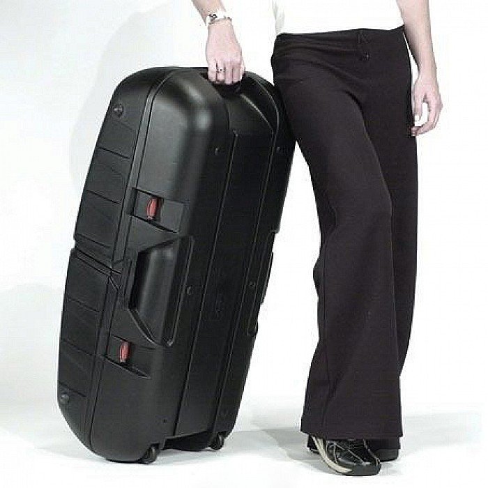 The carrying case provides storage for everything needed for sound, including plenty of room for optional accessories such as microphones and cables. In addition to the included folding speaker stand, the case even includes luggage style wheels to roll the entire system away.