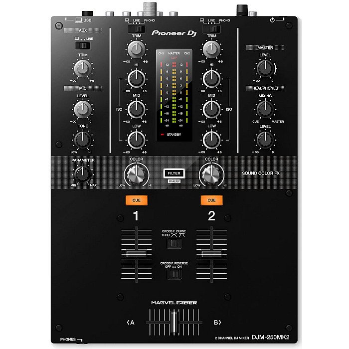 The Pioneer DJ DJM-250MK2 is a versatile 2-channel DJ mixer packed with a range of professional features, making it an excellent choice for beginner DJs, hobbyists, professionals, and scratch enthusiasts alike. Equipped with a high-quality 24-bit audio interface, the DJM-250MK2 ensures seamless connection to a computer while delivering exceptional sound quality. Of particular interest to scratch DJs is the precise and durable Magvel crossfader, designed for smooth and accurate transitions. Additionally, the mixer features Sound Colour FX filters that enable creative sound shaping, along with 3-band isolators for precise frequency adjustments. The smooth channel faders ensure effortless control, while dual headphone outputs and an independent microphone section provide maximum flexibility. With its clear and intuitive layout, the DJM-250MK2 offers a user-friendly experience that caters to both beginners and seasoned DJs. Combining premium features with ease of use, this mixer sets a new standard in its class.