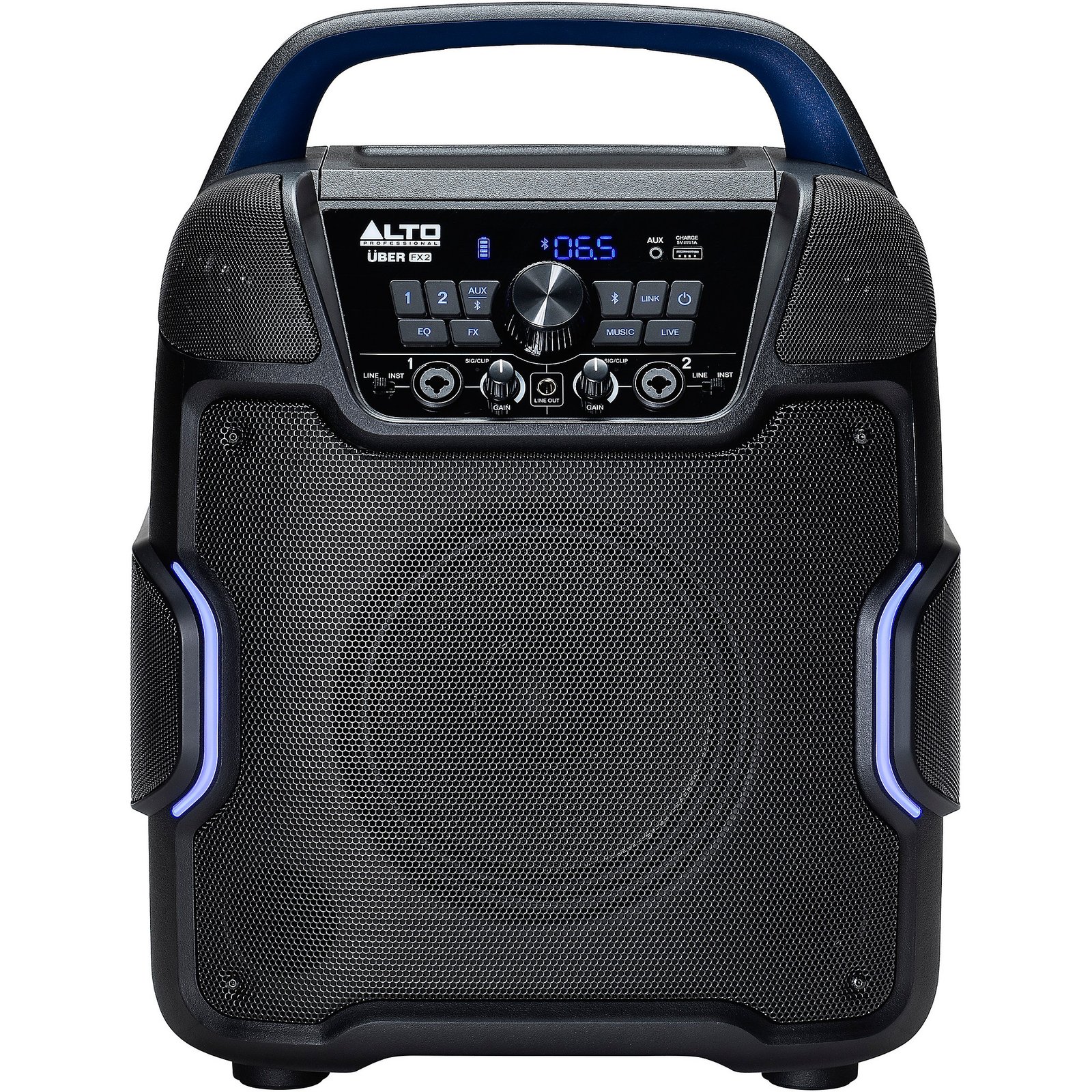 The Uber FX MKII's innovative speaker system is designed to deliver clear, full-range sound to your entire audience. It features a potent 200W power amp to drive its 5-speaker array, which comprises an 8" woofer for deep lows, tweeters for crisp highs and side-firing full-range drivers. Together, these provide 320° of listening area so everyone enjoys an immersive audio experience. The side-firing speakers are also ideal for personal monitoring during live performance. To help you shape your sound, the Uber FX MKII gives you control over two discrete input channels. Each channel has its own volume knob and 2-band EQ so you can set the perfect level and tone for mics, instruments or other sources. You also get a selection of digital effects like reverb, delay, chorus and more to add richness and ambience. The two channels make it easy to get a good blend between vocal mics and backing tracks or instruments. An additional AUX input handles devices like MP3 players. Use the free Uber FX Control app to adjust channel levels, EQ, effects and more right from your mobile device.