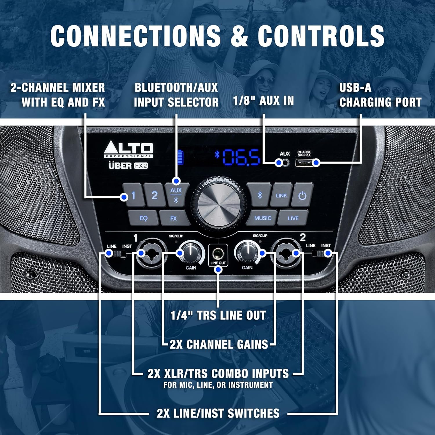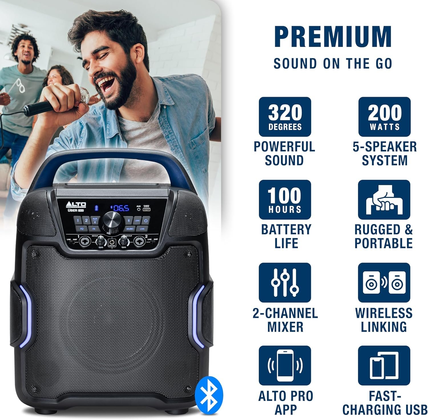 With Bluetooth 5.0 wireless technology, the Uber FX MKII lets you stream audio from any Bluetooth-enabled device like a phone, tablet or laptop. You can play tracks for backing music or audio playback without cables getting in the way. For complete wireless control, use the Alto Pro app to adjust parameters in real time from anywhere in the venue. You can also wirelessly link two Uber FX MKII units to instantly create a stereo PA system using your favorite music streaming app.