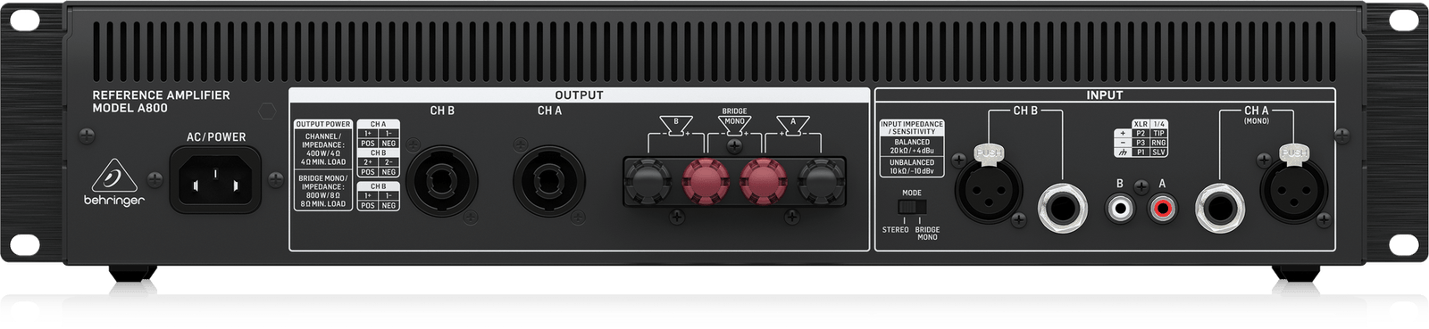 The Reference Amplifier A800 is designed to do two things: offer impressive flexibility and deliver excellent sound. For typical stereo situations, it delivers a healthy 400 watts into each channel at 4 ohms. Need more power? No problem — in bridged-mono mode, the A800 delivers 800 watts into a single channel. No matter how you use it, the A800 exhibits remarkable headroom, resulting in pristine audio reproduction. The A800 punches well above its weight. Behringer’s SmartSense Technology yields a linear frequency response at any speaker load impedance. On top of that, the A800’s impressive damping factor offers superior amplifier control over your speakers, ensuring top-notch sound reproduction. When combined with quality loudspeakers, the A800 yields powerful, dynamic bass and ultra-smooth high frequencies.