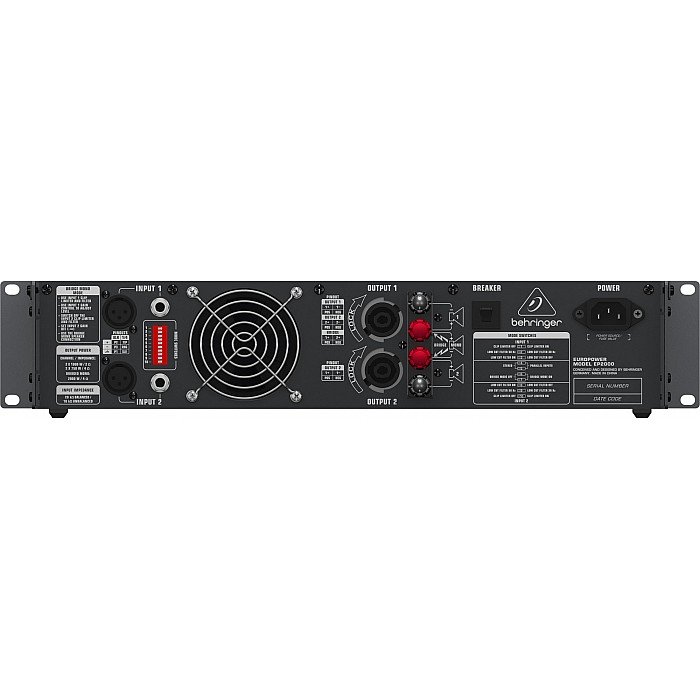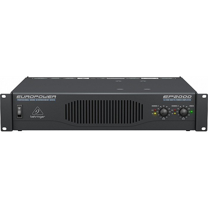 The rackmountable EP2000 EUROPOWER power amp from Behringer delivers up to 2 x 1,000 watts at 2 ohms, 2 x 750W at 4 ohms, and 2,000W at 4 ohms in bridge mode. Its Precise Power, Signal, and Clip LEDs let you monitor performance, and its XLR and 1/4" TRS jacks allow for compatibility with any source. Selectable low-frequency filters let you remove distracting infra-sound frequencies, and its independent DC and thermal overload protection on each channel automatically protects your amp and speakers without stopping the show. The Behringer EUROPOWER's professional speaker connectors and "touch-proof" binding posts support most speaker wiring systems.