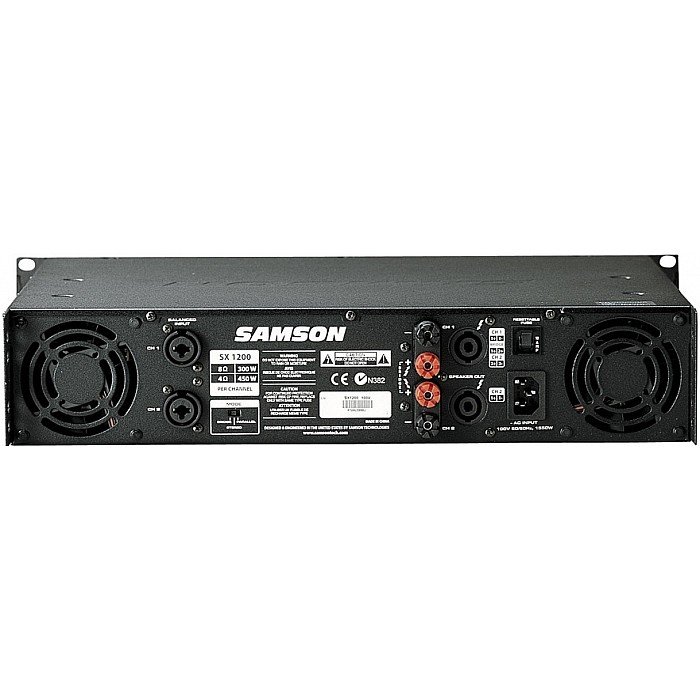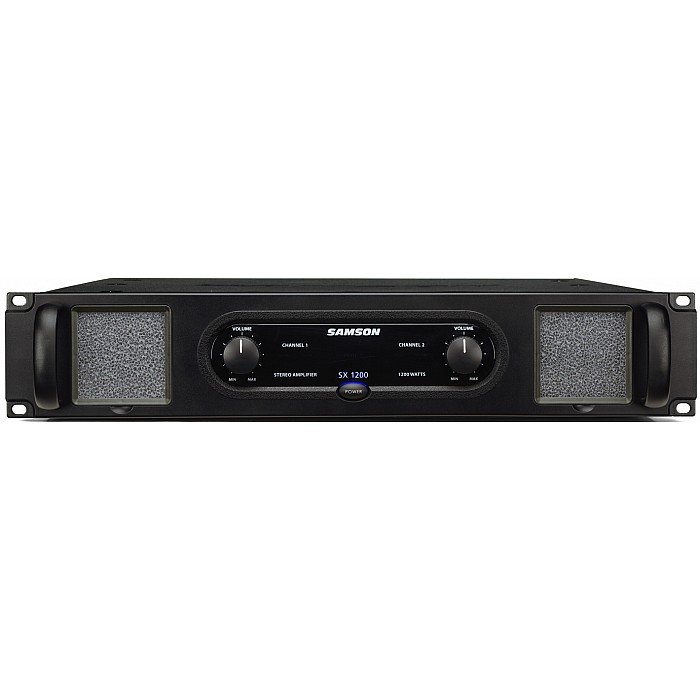 The Samson SX1200 stereo power amplifier has been designed to provide robust, clean output with low distortion and wide dynamic range, along with the dependability demanded by professional audio engineers and installers.The convenient two rackspace design is compact, and yet there's plenty of power available, with 2 x 300 watts at 8Ω and 2 x 450 watts at 4Ω over the full frequency spectrum, from 10 Hz to 55 kHz.For mono applications, a bridged mode links both channels of the amplifiers, thus providing even more power, with a power rating of 900 watts for the SX1200 into an 8 ohm load.Input connections are made via combination connectors allowing for both balanced XLR and balanced 1/4" TRS connections. For the outputs, the SX1200 amplifier provides standard 5-way binding posts, as well as Speakon™ connectors.