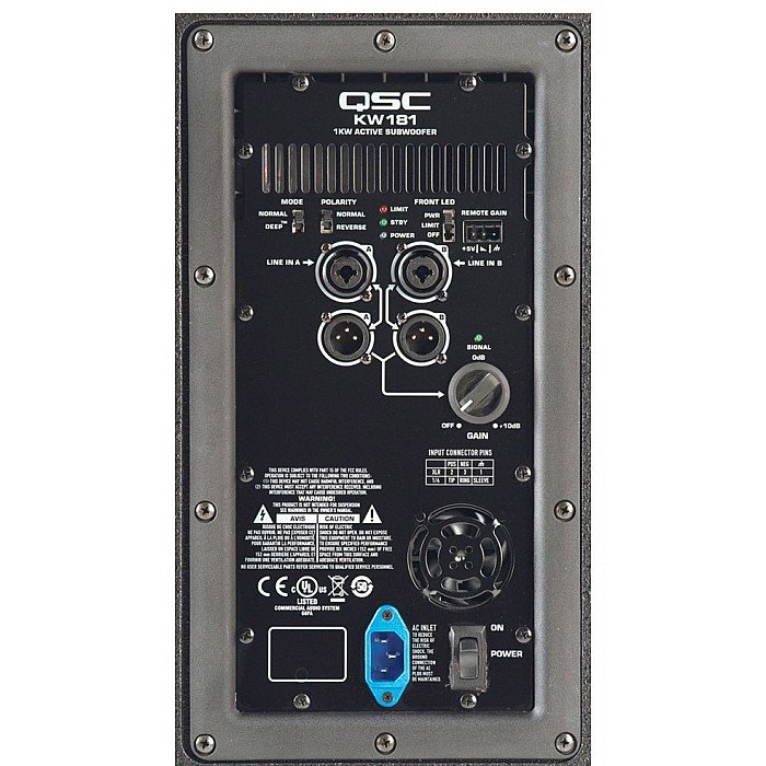 The QSC KW181 subwoofer speaker features dual balanced female XLR / 1/4" line level input, dual balanced male XLR full-range line leave out, remote gain control via a potentiometer (sold separately), and a locking IEC power connector.