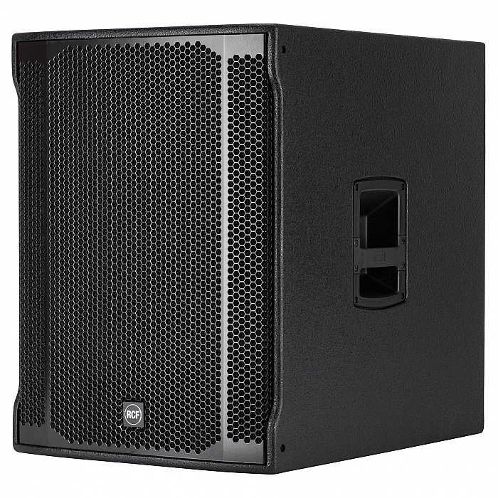 The RCF cabinets are made of the best multi-ply hardwood coated with a textured black finish. The subs are stackable and light-weight, for easy set-up and tear down, thanks to the ergonomic handles. A pole receptacle on top and side allows the use of the box in various configurations. The powder coated front grille integrates a special transparent-to-sound foam backing on the inside to further protect the transducers from dust.
