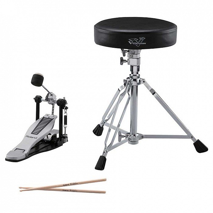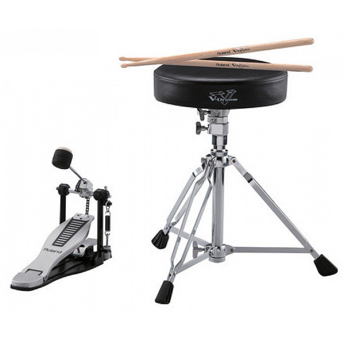 This handy drum accessory package is especially suitable for entry-level V-Drums owners, allowing them to start playing their V-Drums right out of the box. Components include a kick pedal, drum throne, and a pair of drumsticks —all carrying the Roland logo and assurance of quality.