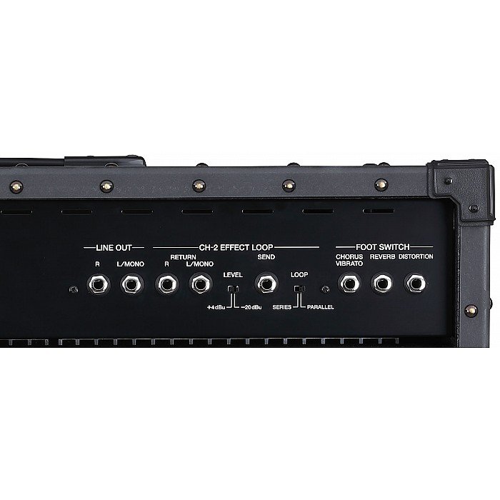 The JC-120’s rear panel is filled with connectivity options. There’s an effects loop for patching in mono or stereo effects, and you even have your choice of serial or parallel operation. Line Out jacks provide a convenient mono or stereo feed for sending your sound to a mixing board or recorder. There’s also support for optional footswitches, allowing you to easily turn the amp’s chorus/vibrato, reverb, and distortion effects on/off while performing.